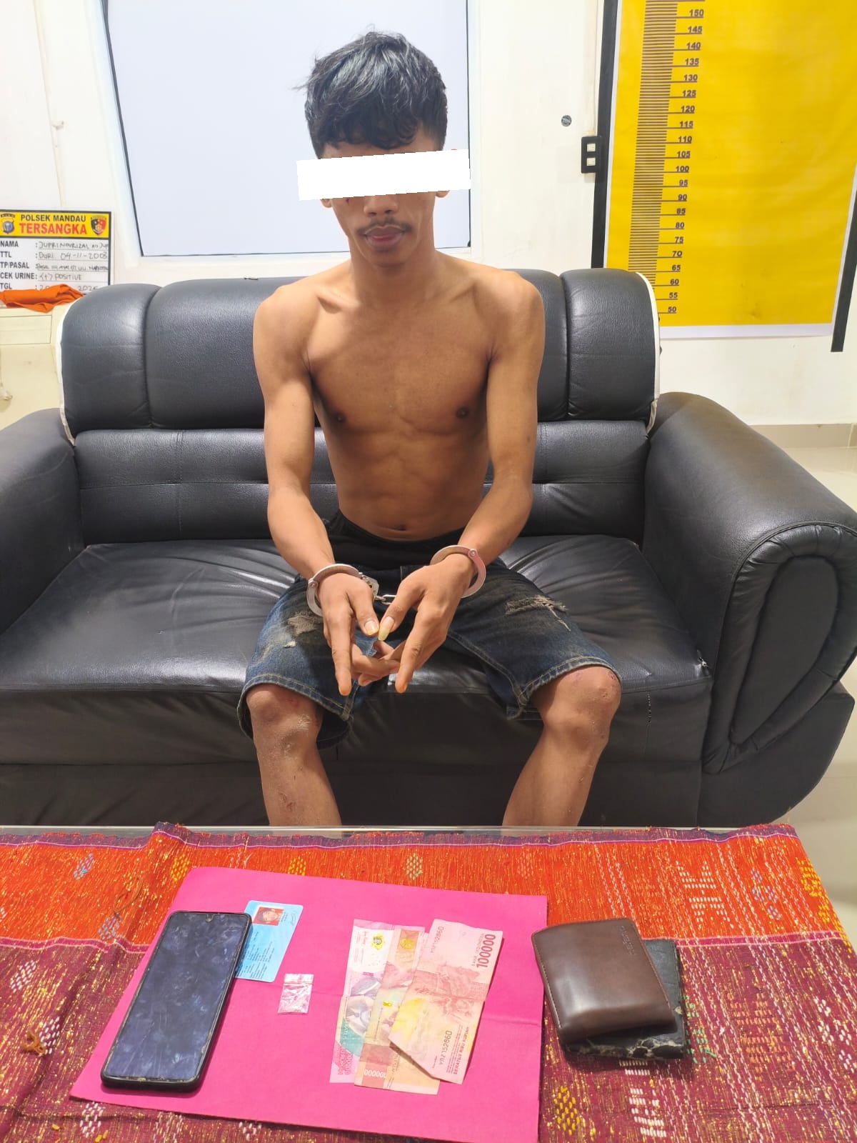 Saat dilakukan penggeledahan, petugas menemukan barang bukti berupa:1 paket diduga narkotika jenis sabu yang disimpan di kantong depan sebelah kanan,1 unit handphone,serta uang tunai sebesar Rp300.000 yang diduga berkaitan dengan transaksi narkotika.